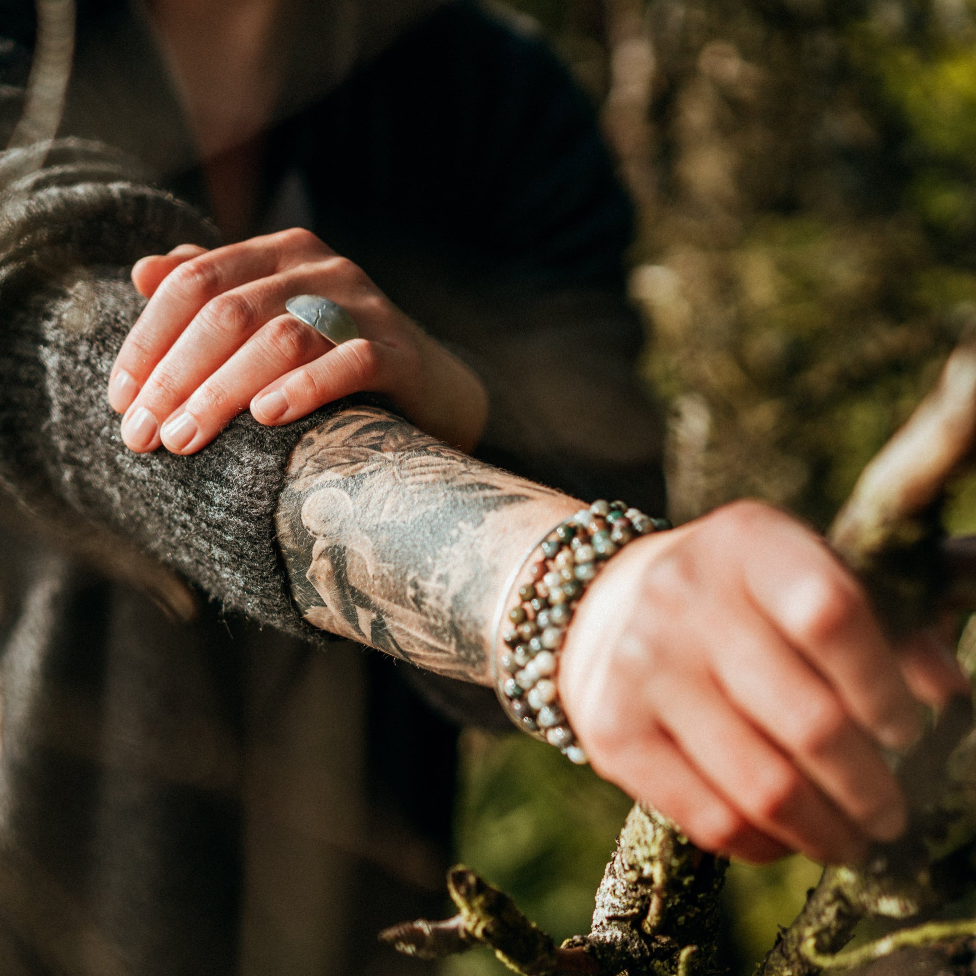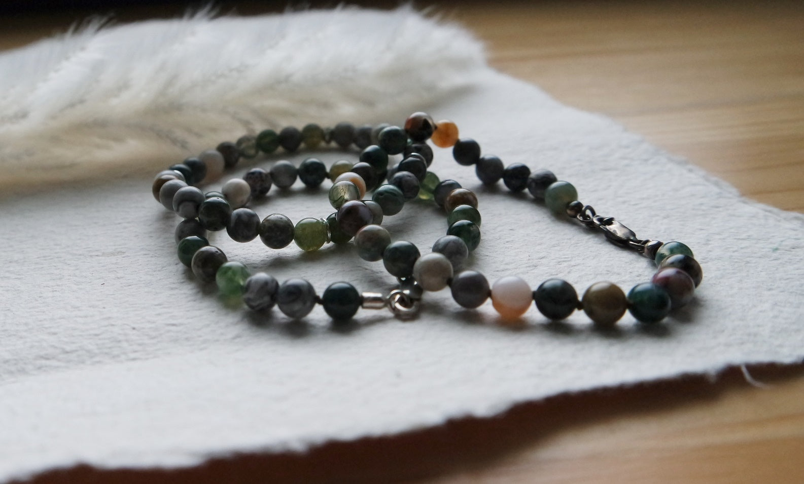 - Material: Moosachatkugeln, Buntjaspiskugeln, Silberelement (925 Recycling Silber)