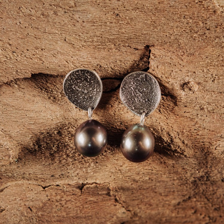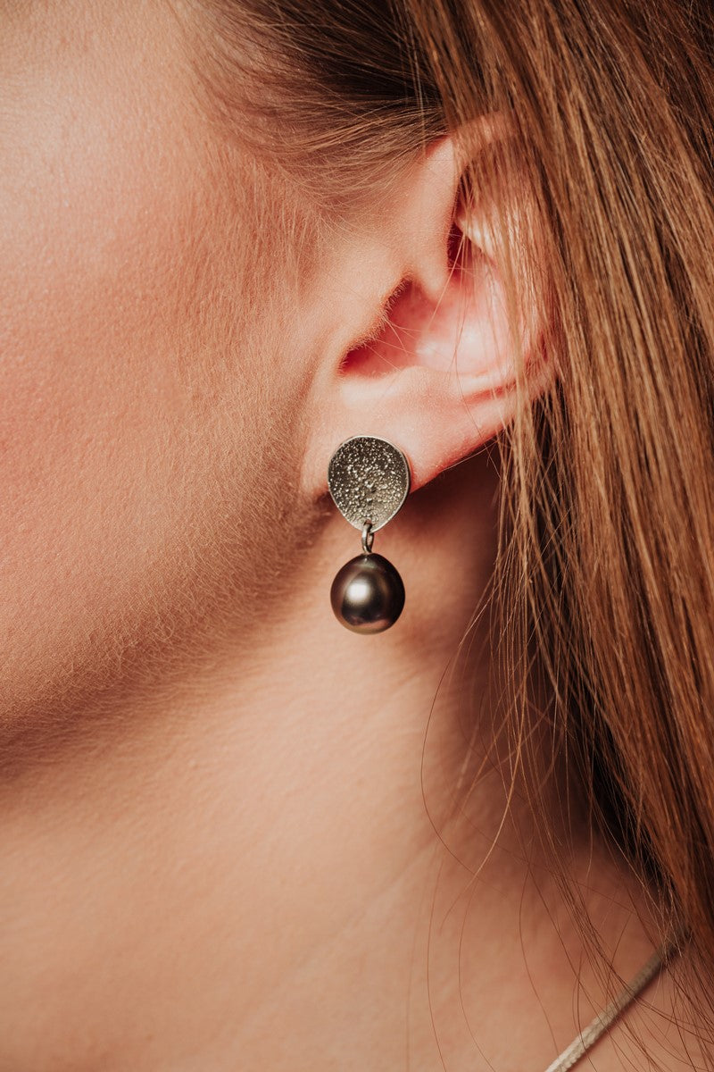 Diese lebendigen Ohrstecker ähneln den organischen Formen der Natur. Um diese Oberfläche zu erzeugen wird Silberstaub aufgeschmolzen, wodurch diese gewollt zufälligen und reizvollen Muster entstanden sind. Die wunderschönen, großen Tahitiperlen machen diese Ohrstecker zu einem absoluten Blickfang.