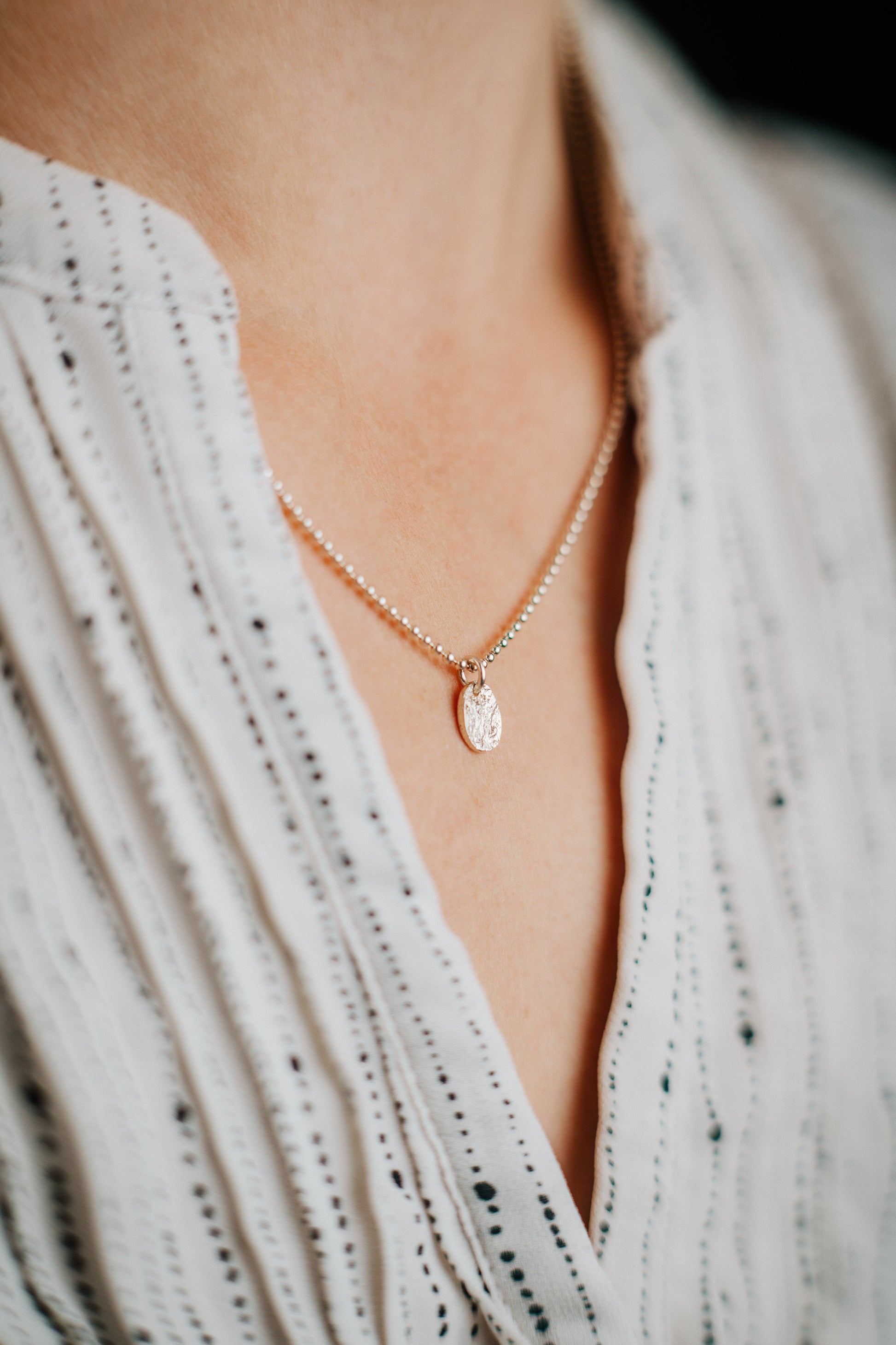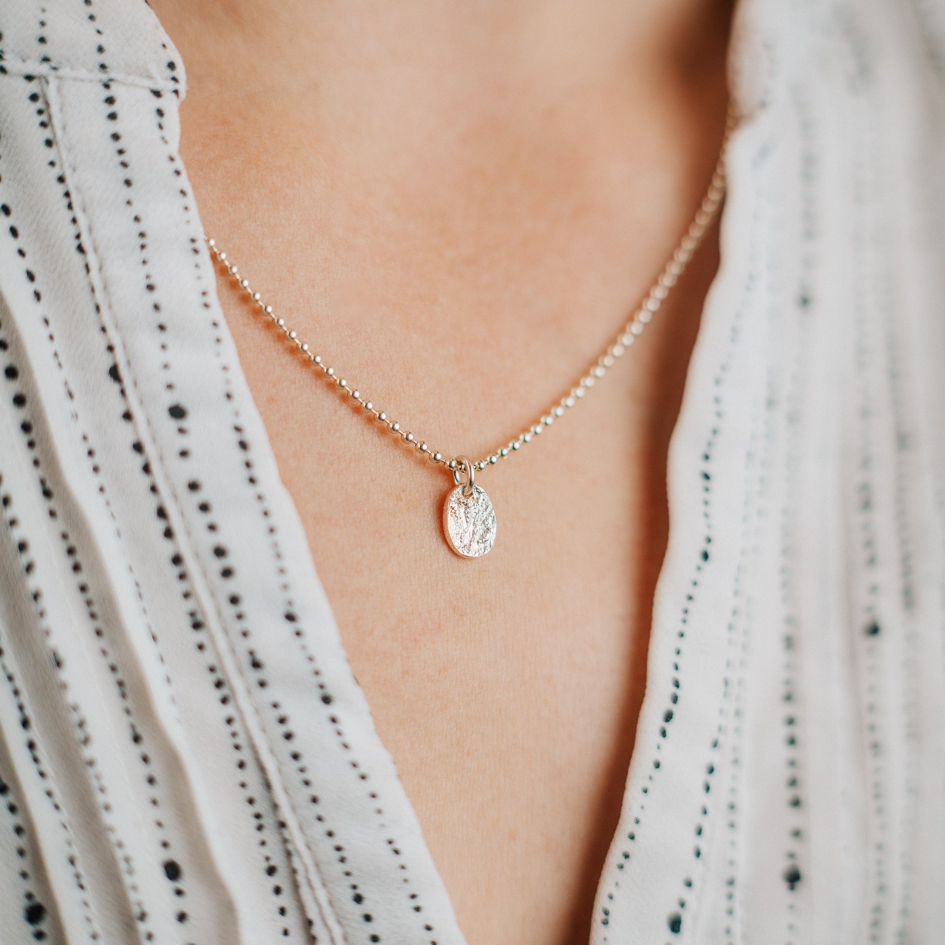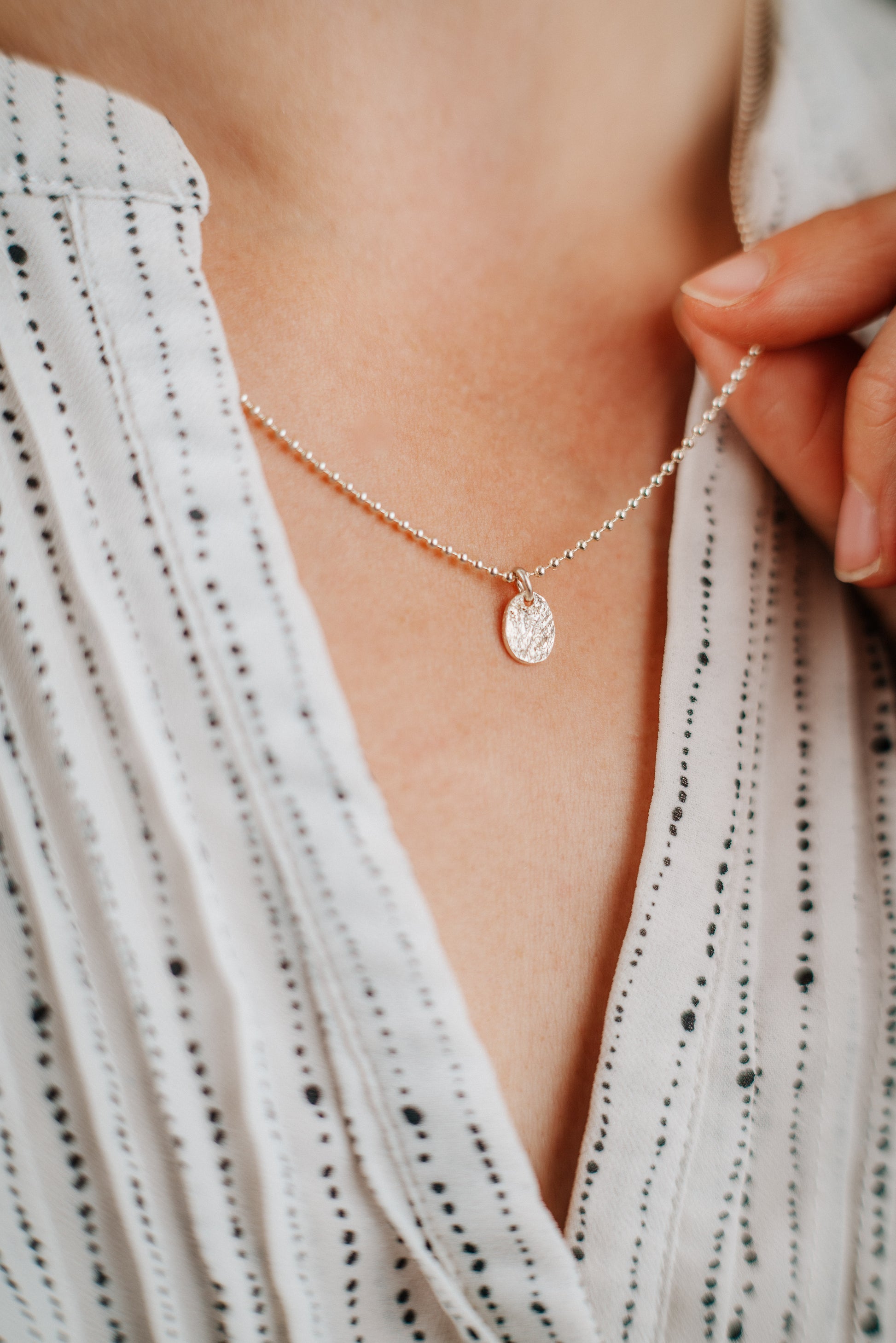 Das zarte Design und der silberne Glanz verleihen der Kette Raffinesse. Der Unrunde Anhänger aus recyceltem Silber gibt dem Collier eine lebendige Note. Als Verschluss dient ein Karabiner