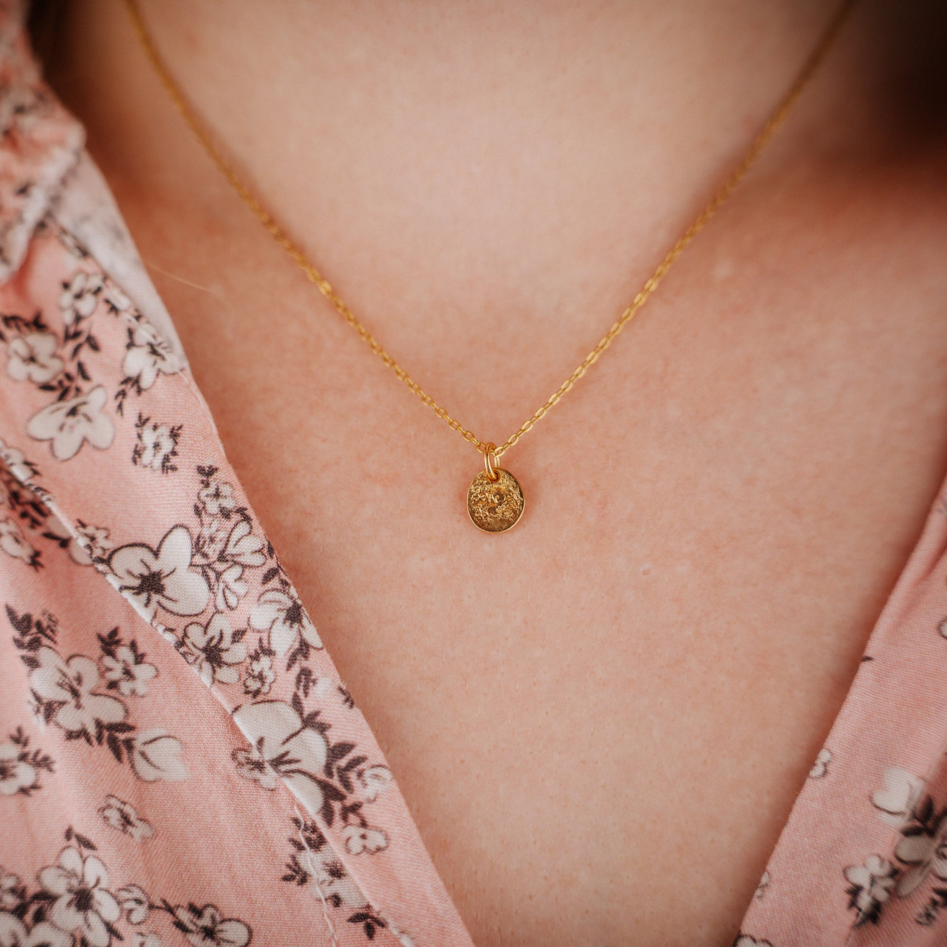 Das zarte Design und der goldene Glanz verleihen der Kette Raffinesse. Der Unrunde Anhänger aus recyceltem Silber 585 vergoldet gibt dem Collier eine lebendige Note. Als Verschluss dient ein Karabiner. Auf Wunsch könnnen wir den Anhänger auch mit einer anderen Gliederkette liefern.