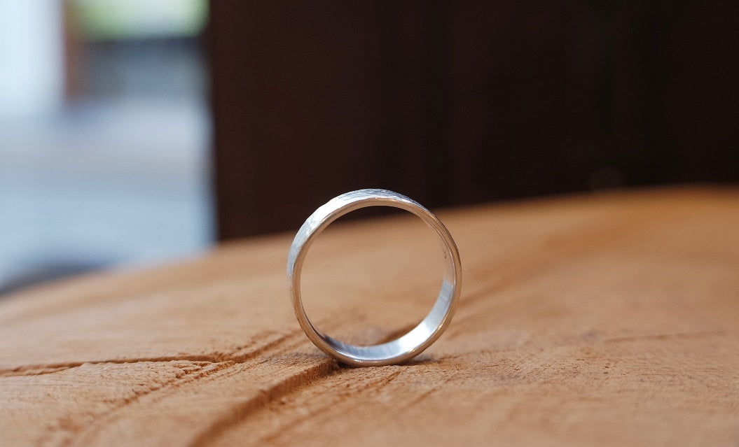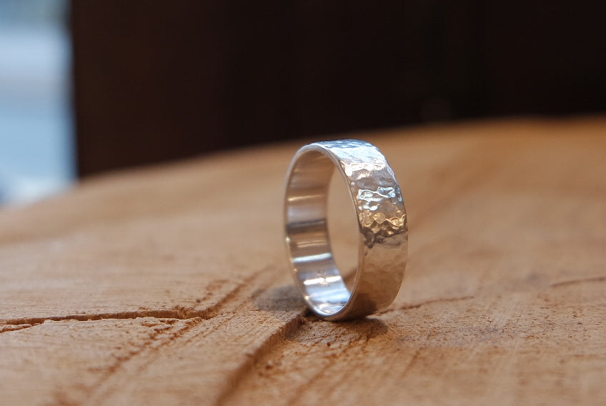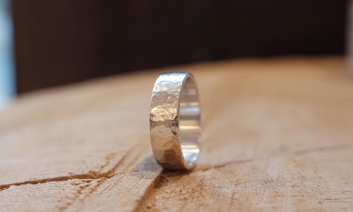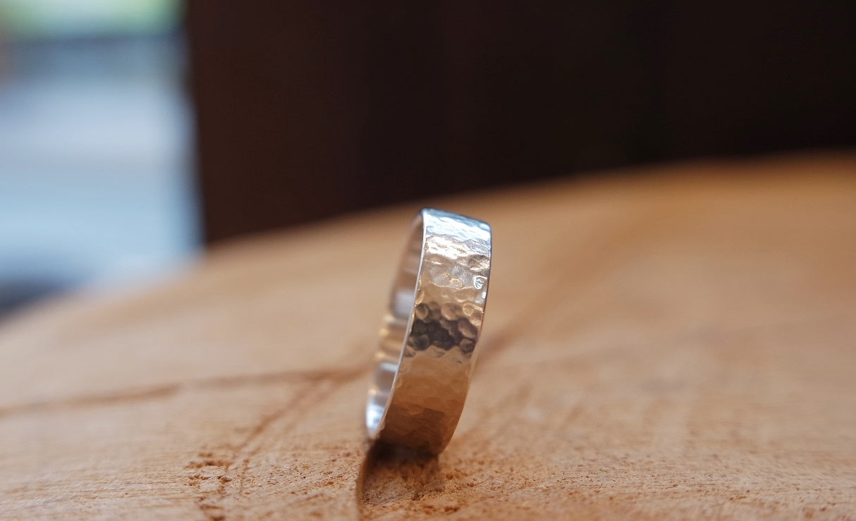 Ein schlichter Silberring mit außergewöhnlichem Hammerschlagmuster. Durch dieses von Hand gefertigte Muster entsteht bei jedem Ring eine individuelle Oberfläche, somit ist er ein perfektes Unikat für den Alltag. Diesen außergewöhnlichen Ring fertigen wir auch gerne als Freundschafts- oder Trauringe an und auf Anfrage auch aus fast jedem Material z.B. 585 Recycling Gelbgold.