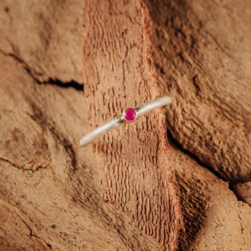 Zarter Silberring mit mit schimmernd rotem Rubin in einer 585 Goldfassung. Der Filly gold ruby ist Teil unserer Filly Kollektion - alle Ringe unserer Kollektion sind perfekt aufeinander abgestimmt und können beliebig kombiniert werden.