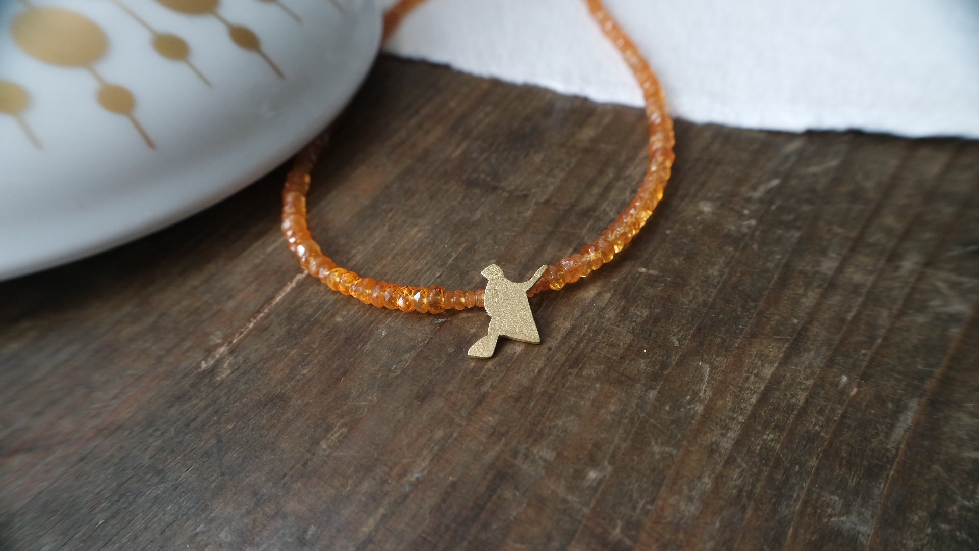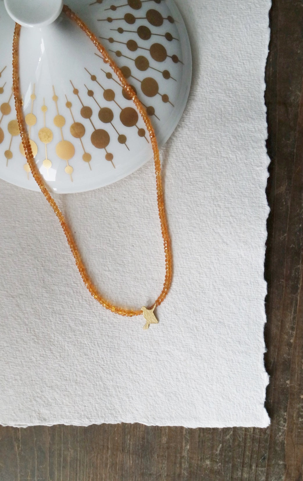 Elegante zartes, Hexencollier mit Mandaringranat. Als Verschluss dient ein vergoldeter Karabiner.