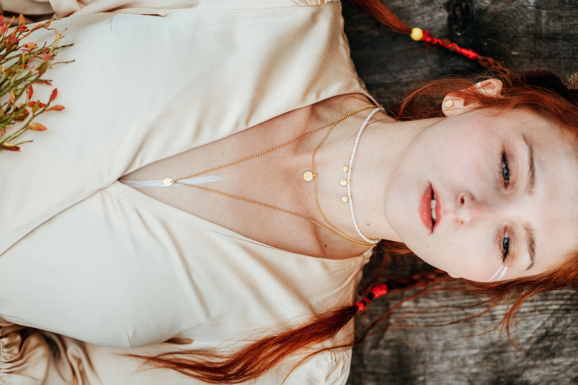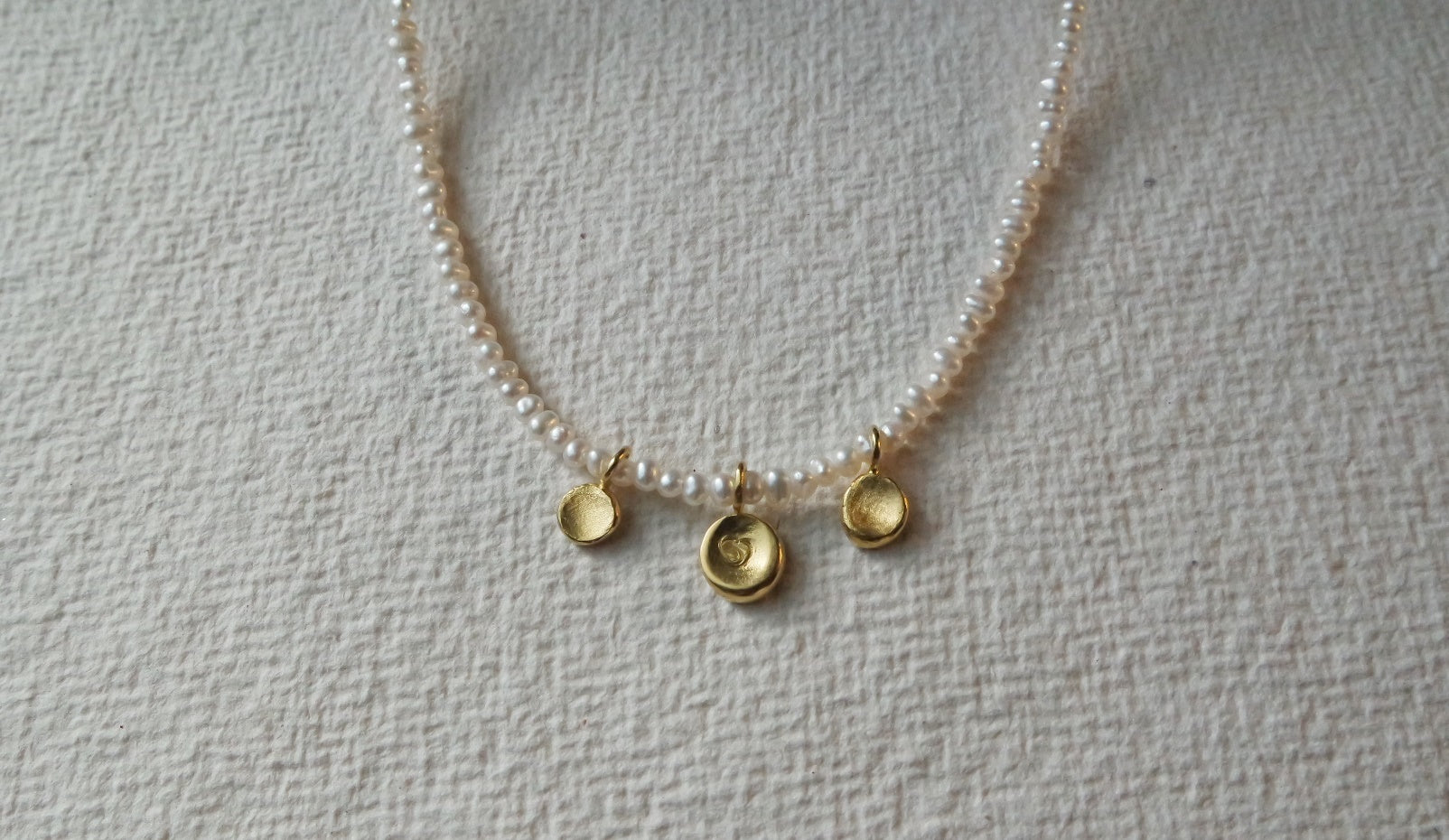 Elegantes, zartes Collier mit cremefarbenden Akoya Perlen und kleinen, organischen Anhängern mit dem SALD Logo in der Mitte. Diese Kette ist ein perfektes Geschenk und wird mit einer unserer typischen SALD harzmade Schmuckdesign Schachteln versendet.