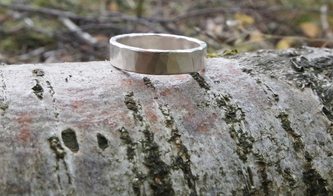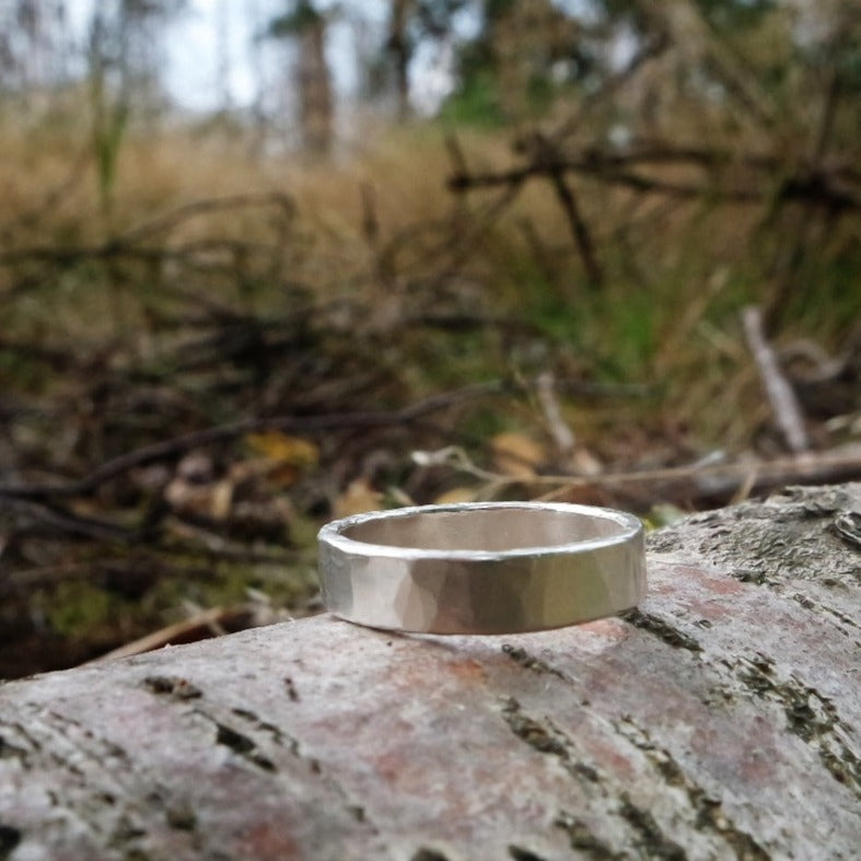Ein schlichter Silberring mit außergewöhnlichem Hammerschlagmuster. Durch dieses von Hand gefertigte Muster entsteht bei jedem Ring eine individuelle Oberfläche, somit ist er ein perfektes Unikat für den Alltag. Diesen außergewöhnlichen Ring fertigen wir auch gerne als Freundschafts- oder Trauringe an.