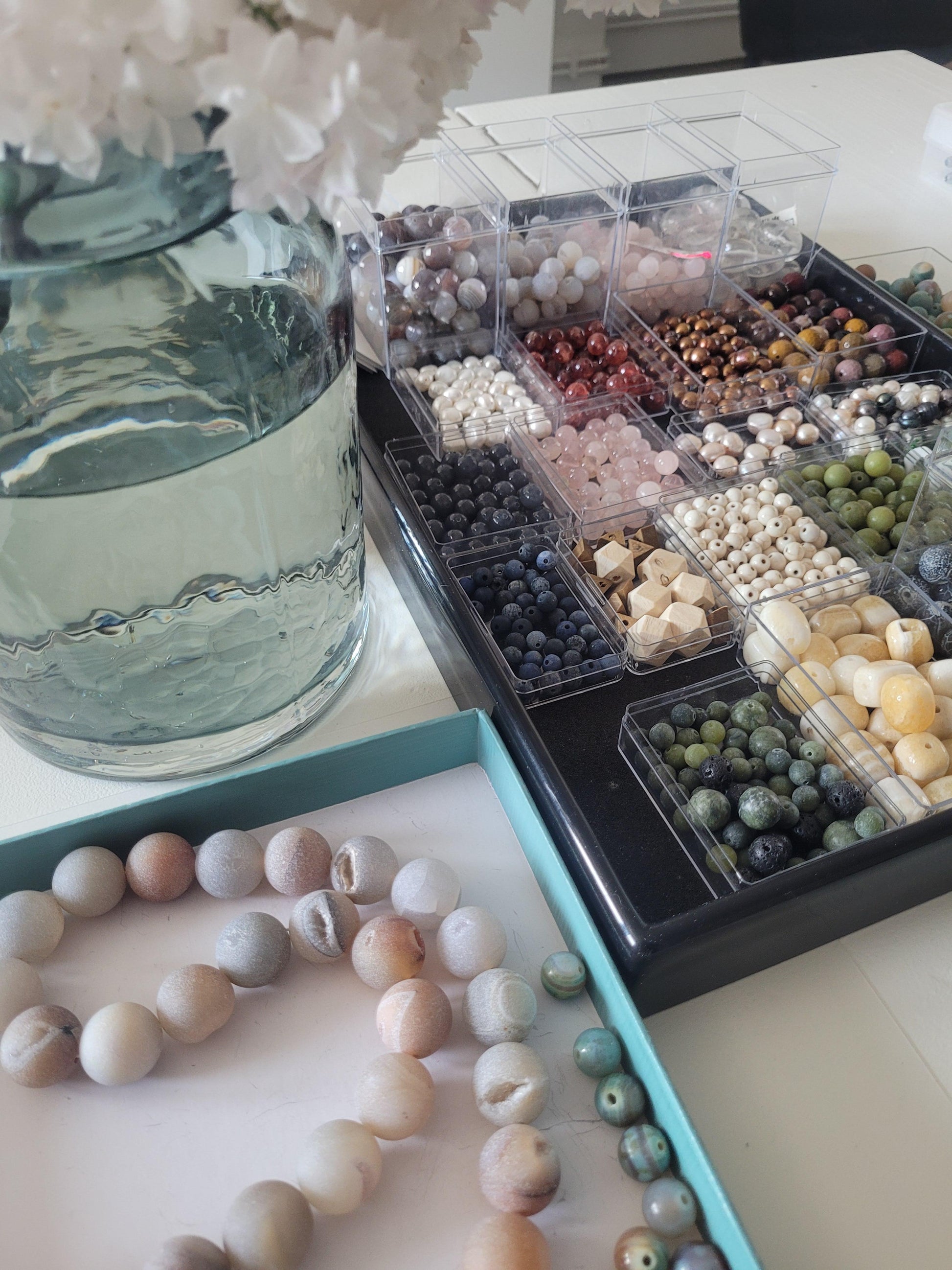 Gestalte dein eigenes Edelsteinarmband, wähle zwischen verschiedenen Steinen (Achat, Jade, Quarz, Jaspis, Mookait, etc.) und Formen (Kugel, Ronden, Scheiben oder getrommelt) deine Lieblinge aus und fädele diese auf ein Gummiband.
